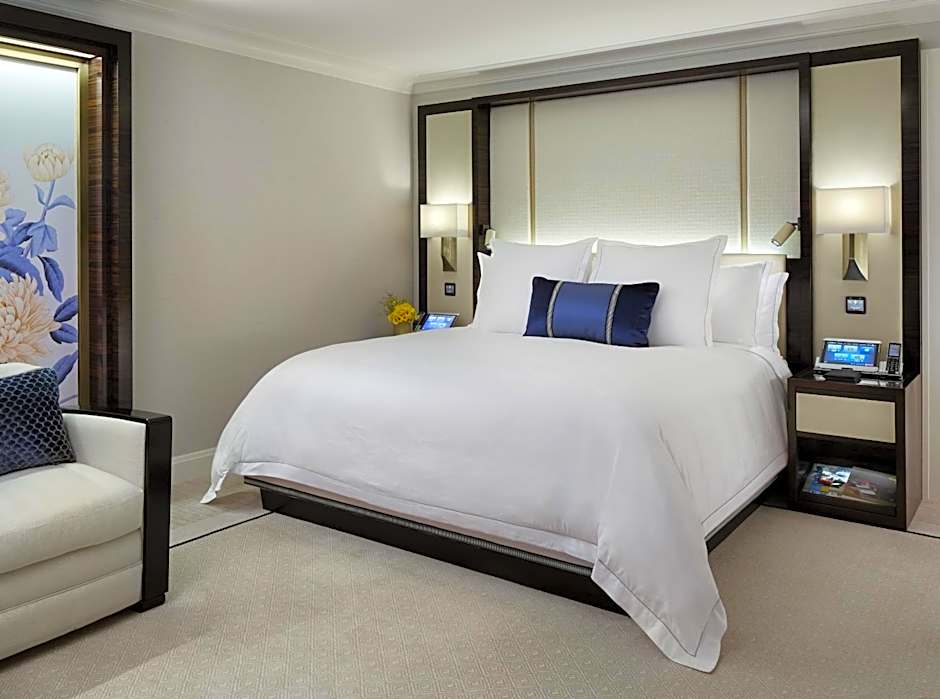 This room offers a 55-inch flat-screen cable TV, a built-in beside charging station and tablet technology to control the room temperature and lighting. The marble bathroom includes a soaking tub and an in-mirror TV.